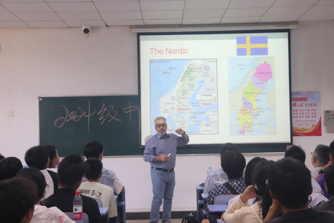 Project leader William Song, Associate Professor Hadan Fleyeh from Dalarna University in Sweden, and Associate Professor Mingjie Han from Dalarna University in Sweden introduced themselves to the students respectively, and showed the students the scenery of Sweden through photos. Teacher William Song expressed his hope that the freshmen can broaden their horizons in college and be brave in pursuing theirdreams.