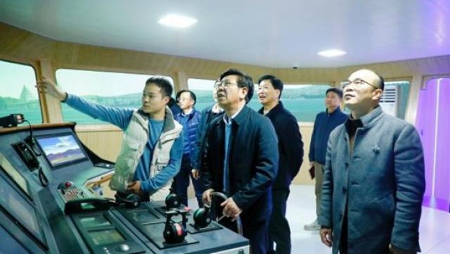 会后,袁红林带队走进教室,与联合培养本科生亲切交流,勉励大家努力学习、学有所成,参观了智能制造实训中心、360船舶操纵模拟器实训室等地。